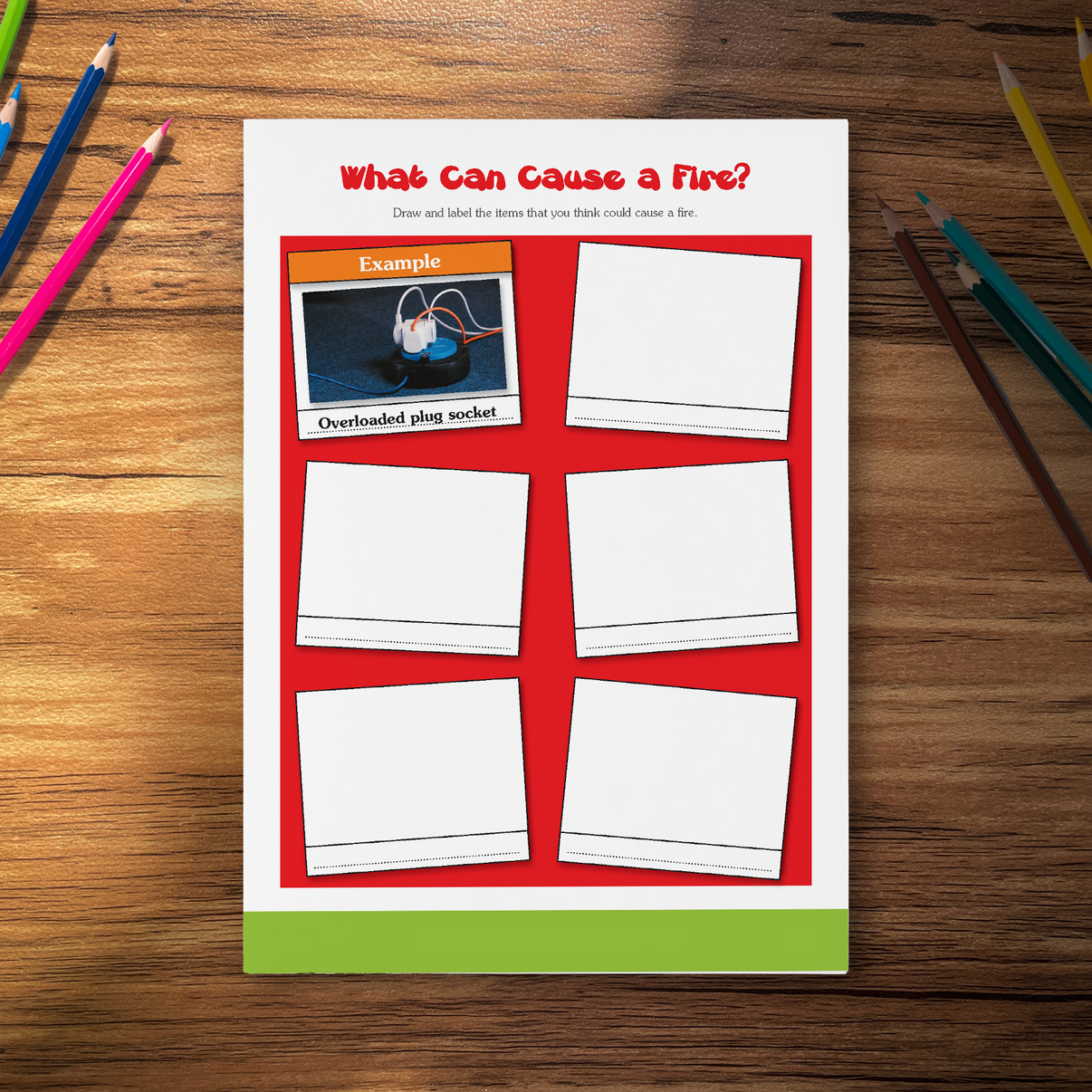 Activities typically involve identifying potential fire hazards in various settings, such as homes, schools, and public spaces. Children are asked to recognise risky items or behaviours, like leaving candles unattended, playing with matches, overloading electrical outlets, or improperly storing flammable materials.