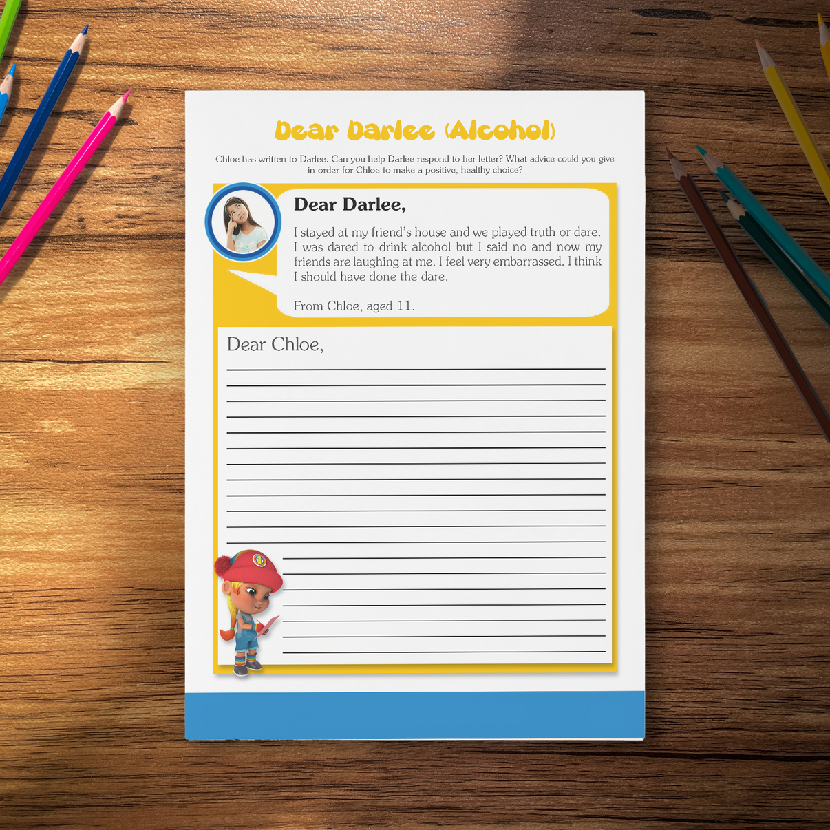 Activities typically involve reading scenarios or letters where Darlee encounters situations involving alcohol, such as peer pressure to drink or witnessing adults consuming alcohol. Children are asked to consider how these situations should be handled and the importance of staying healthy.