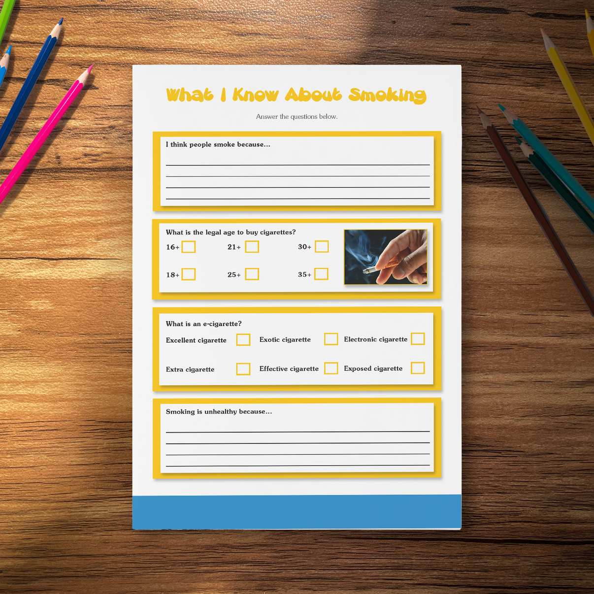 Children are engaged in exercises like identifying the health risks associated with smoking, understanding why people start smoking and discussing strategies to resist peer pressure related to tobacco use. The worksheets can include role-playing scenarios for saying no to cigarettes, creating anti-smoking posters, and writing essays or reflections on the impact of smoking.