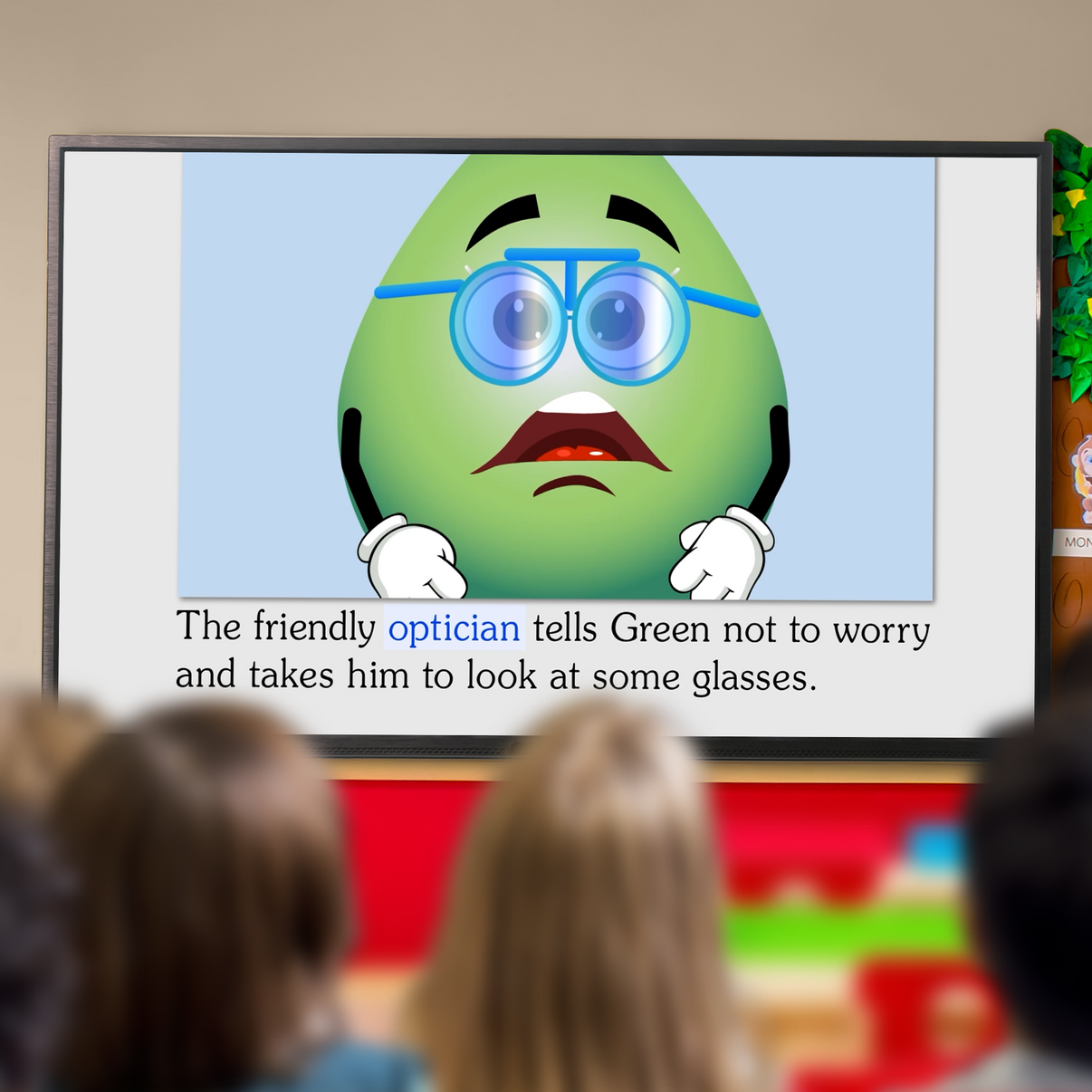 Green Gets Glasses Read-to-me. Green feels worried. Each day in school and at home he has been finding it hard to see things. When he reads a book, it gets blurry and gives him a headache. After a visit to the optician, he arrives at school with new glasses. At first, he is worried, but his kind friends help him overcome this feeling. But his family says he looks very smart, and his friends say he looks great and some even want to try his new glasses.