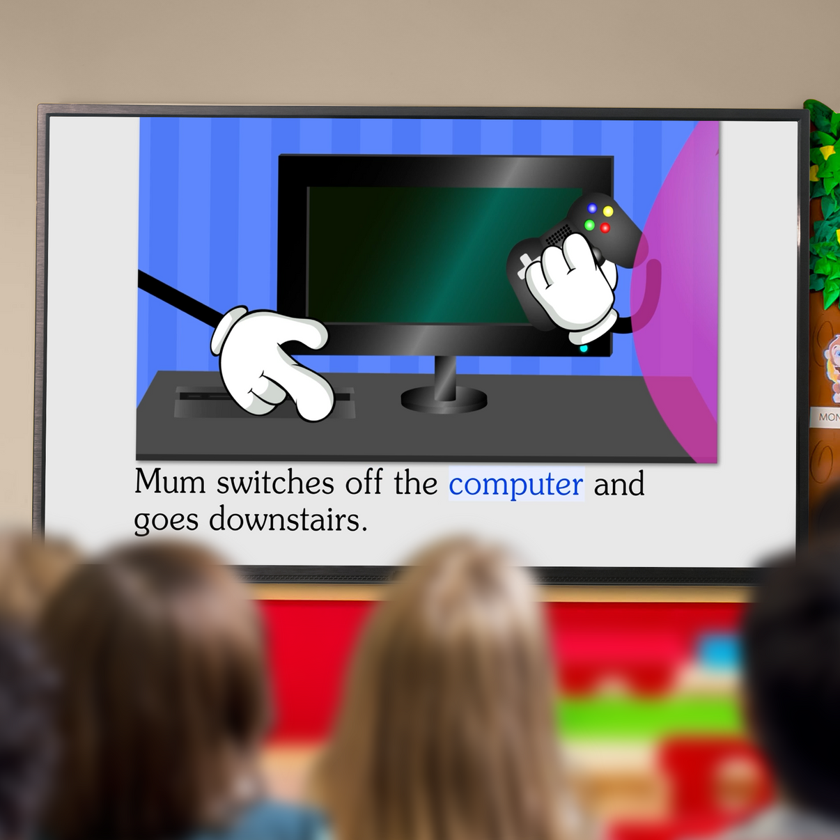 Pink has just arrived home from school. Excitedly, he runs to see if his latest game has fully downloaded on his console. It has! Pink is delighted as now he can play his game. Mum calls for Pink to come and have his dinner.