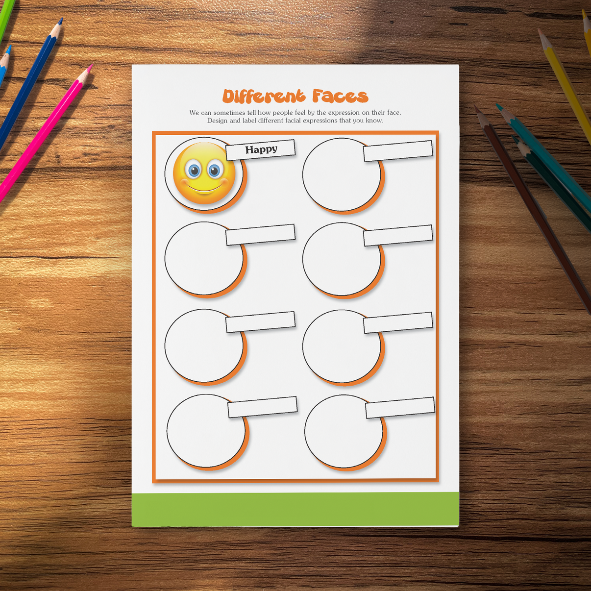 The "Different Faces" Activity Worksheets are designed to help children understand and appreciate the diversity of human emotions and expressions. These educational tools focus on teaching children to recognise and interpret various facial expressions, linking them to corresponding emotions. This exercise is vital for developing empathy and emotional intelligence in young learners.