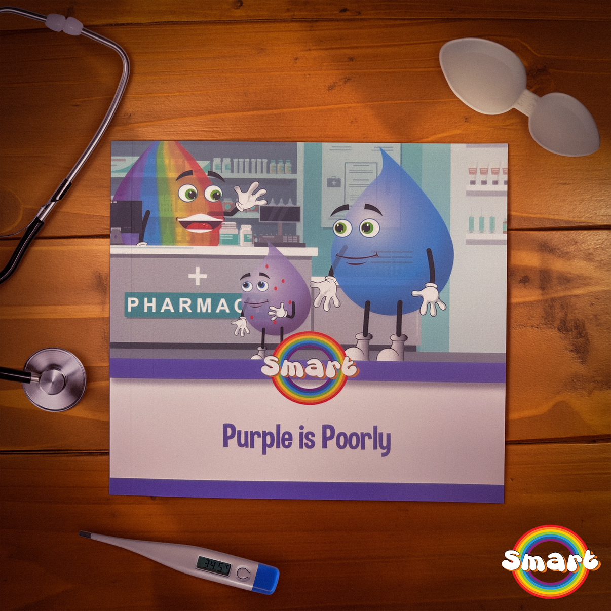 "Purple's Healing Journey" unfolds as Purple wakes up feeling unwell, with a sore throat, itchiness, and a body covered in spots. Distressed, she calls for her daddy, who assures her he will contact the doctor. The story follows Daddy and Purple's visit to the doctor's surgery and the pharmacy, documenting her path to recovery.