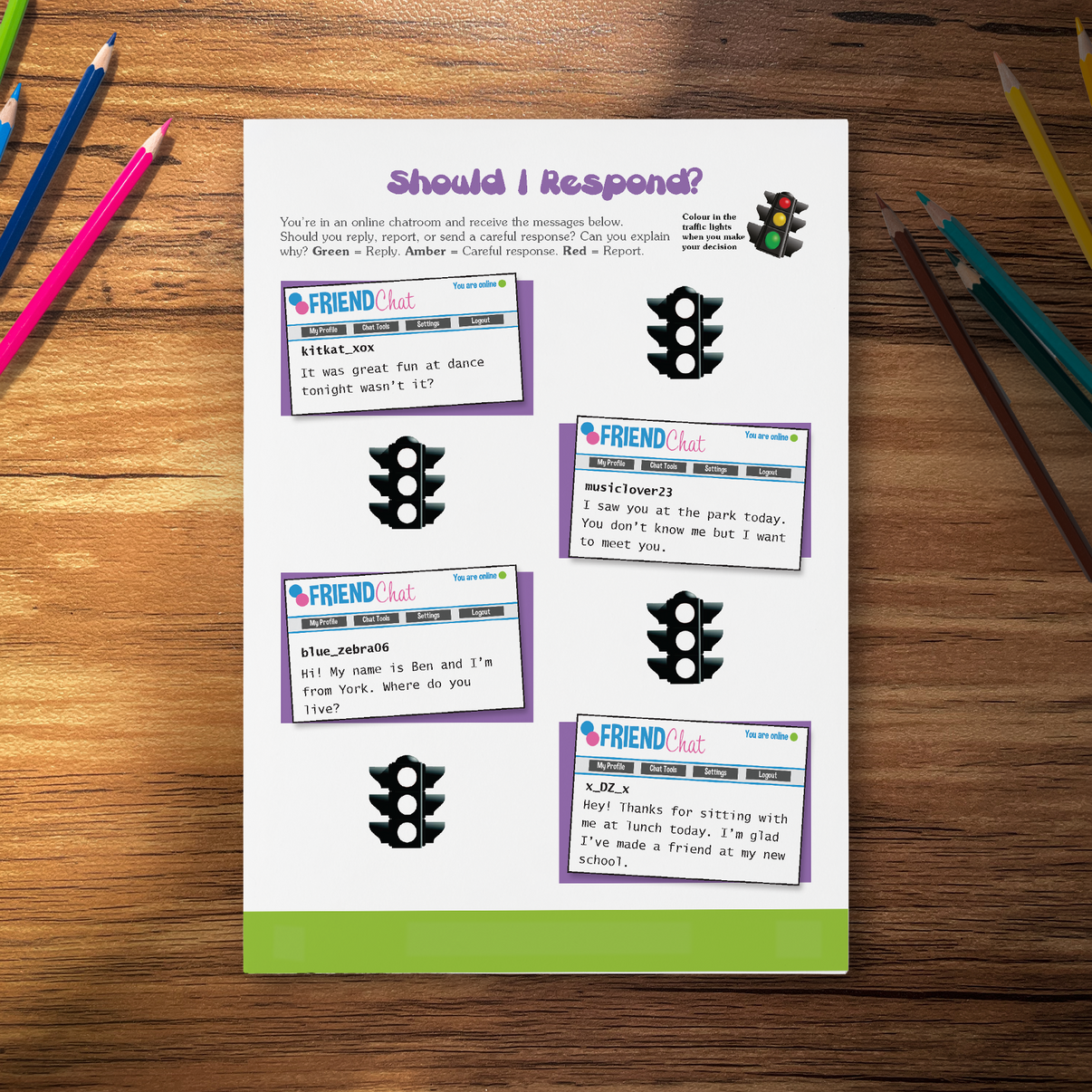 Activities typically present a range of scenarios, such as receiving a message from a stranger online, being teased at school, or witnessing a friend being left out. Children are asked to consider these situations and decide whether a response is needed and, if so, what kind of response would be appropriate.