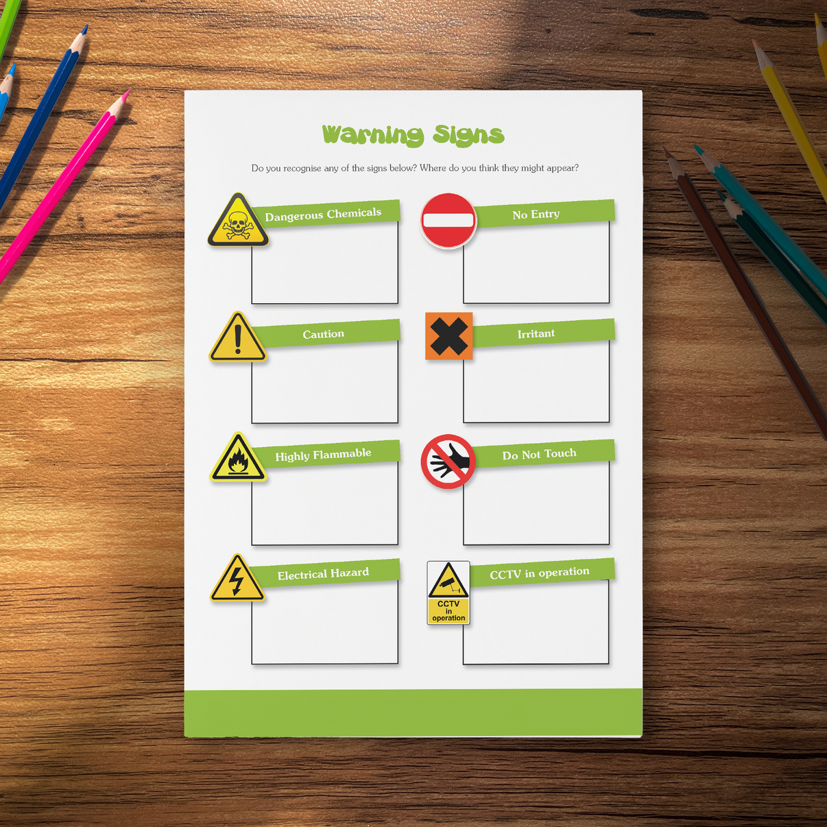 The "Warning Signs" Activity Worksheets are designed to teach children about recognising and understanding different types of warning signs and signals they may encounter in various environments. These worksheets typically include textual descriptions and visual representations of common warning signs, such as traffic signals, hazard symbols, emergency alerts, and safety instructions.