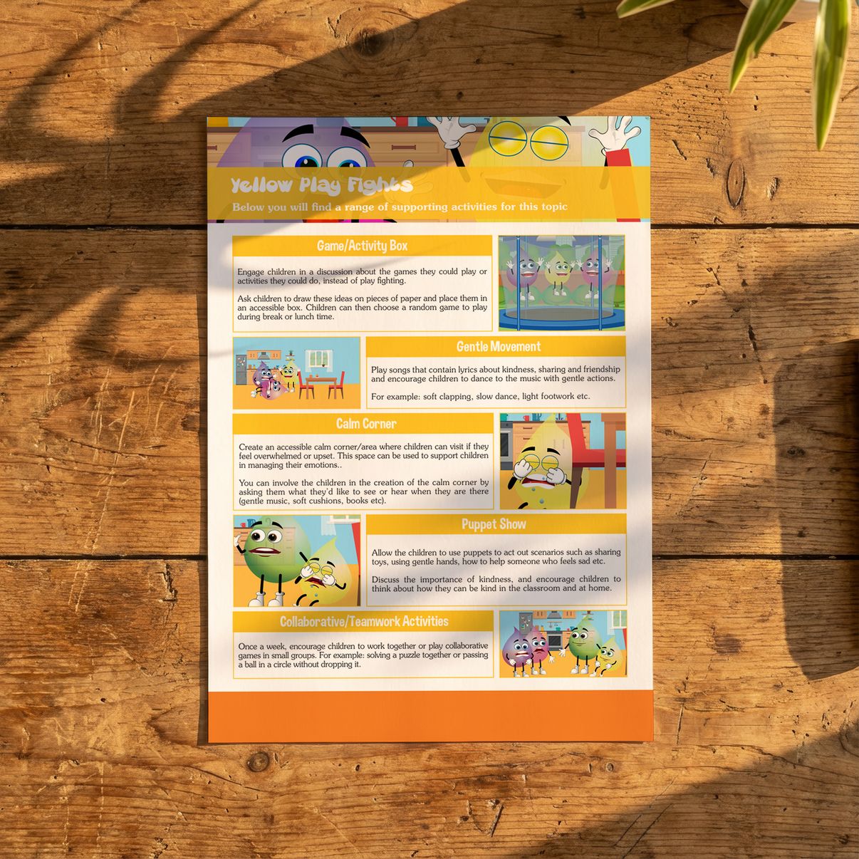 Yellow Plays Fight is a 1-page EYFS activity ideas PDF designed to help children recognise big feelings, manage physical behaviour safely, and explore positive alternatives to fighting.